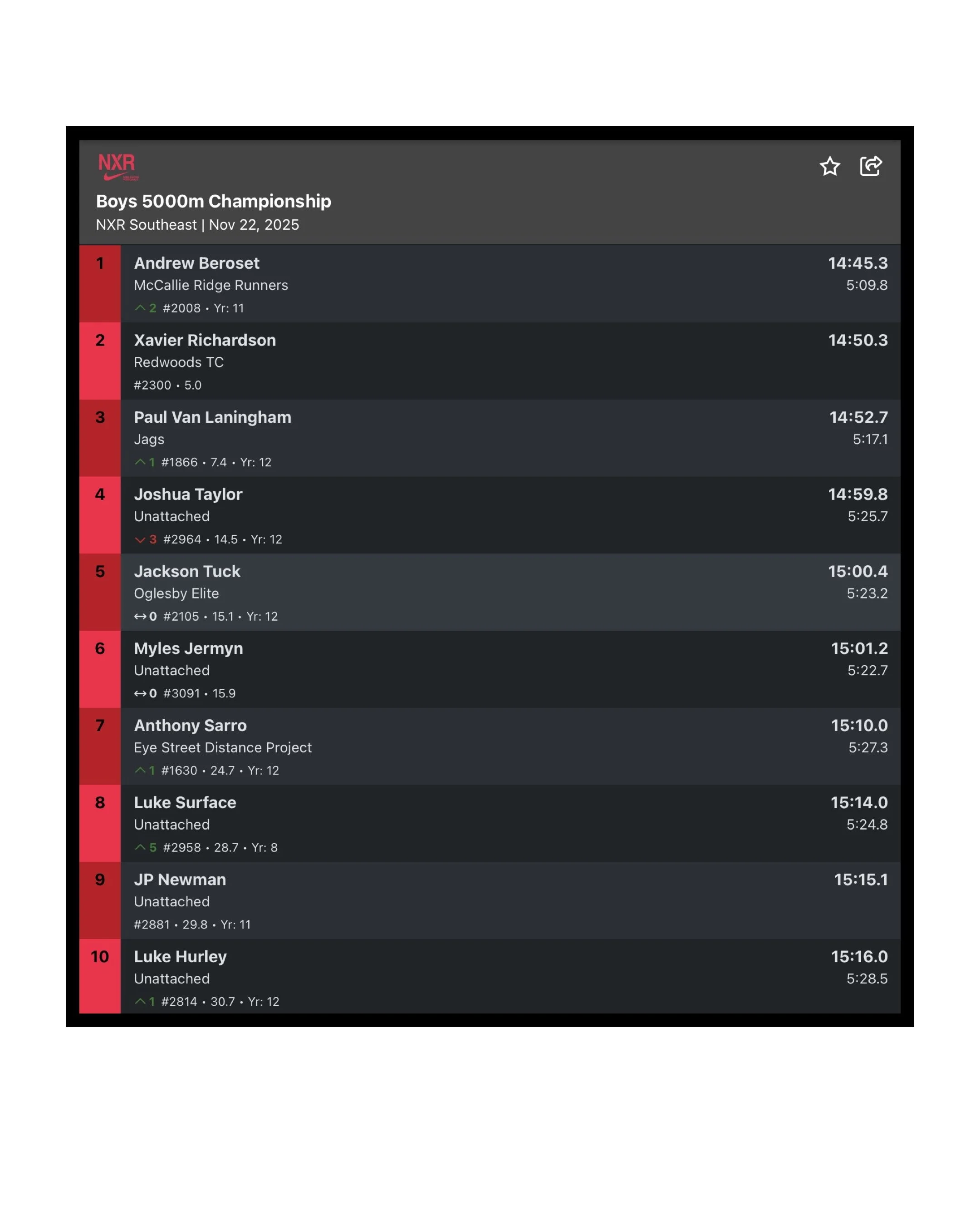 On the boys course, Andrew Beroset of McCallie Ridge Runners surged ahead to win the boys Championship 5K in 14:45.3, outpacing a deep field and clinching his first NXR Southeast title.
